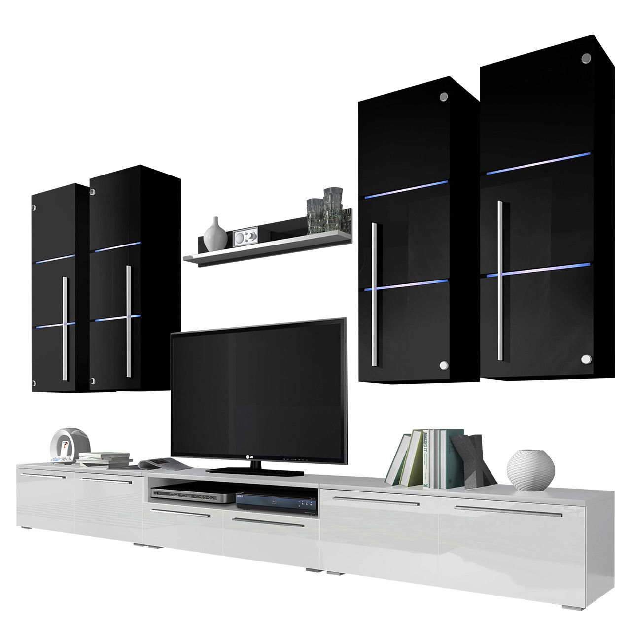– Περιλαμβάνει 1 βάση τηλεόρασης με ντουλάπια και ράφι,2 βάσεις τηλεόρασης με ντουλάπια, 4 κρεμαστά ντουλάπια και 1 ράφι