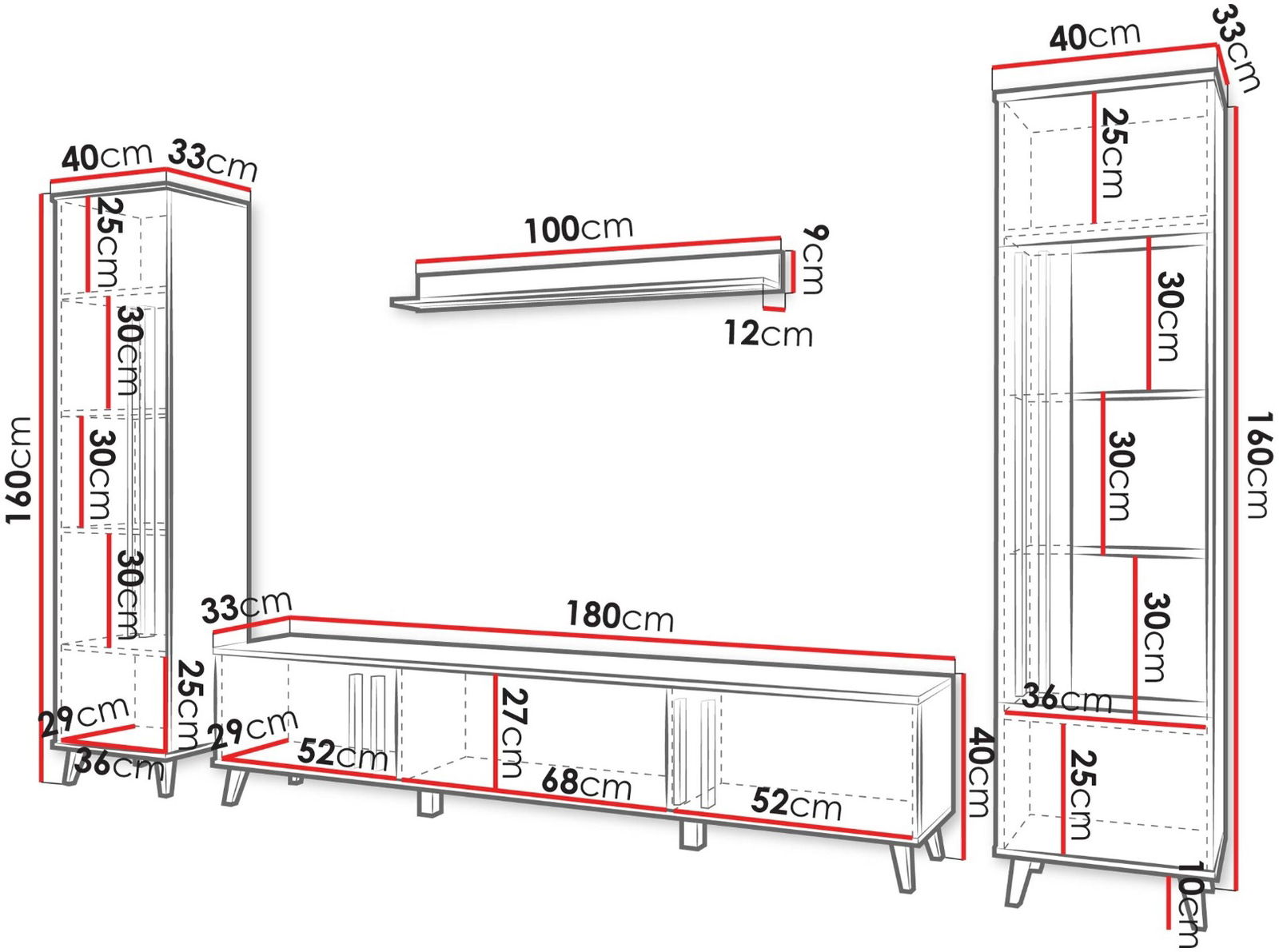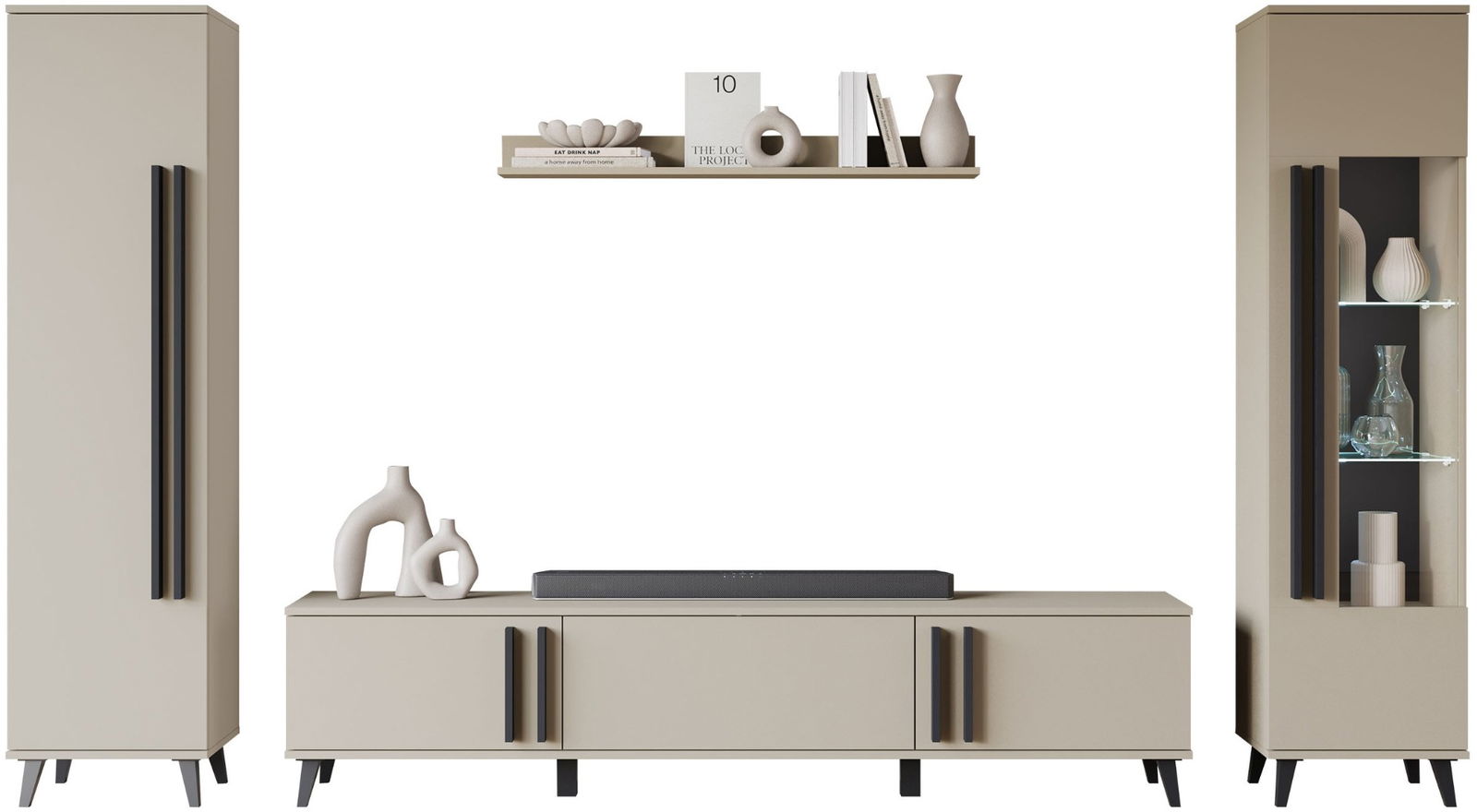 Το σύνθετο σαλονιού Helsinki II συνδυάζει κομψότητα και λειτουργικότητα με μοντέρνο σχεδιασμό. Αποτελείται από στήλη, βιτρίνα, ράφι και έπιπλο τηλεόρασης, όλα με μαύρα πόδια για ευκολότερο καθάρισμα και ανάλαφρη αισθητική. Προσφέρει άφθονους χώρους αποθήκευσης, ενώ οι γυάλινες βιτρίνες αναδεικνύουν διακοσμητικά ή πορσελάνες.