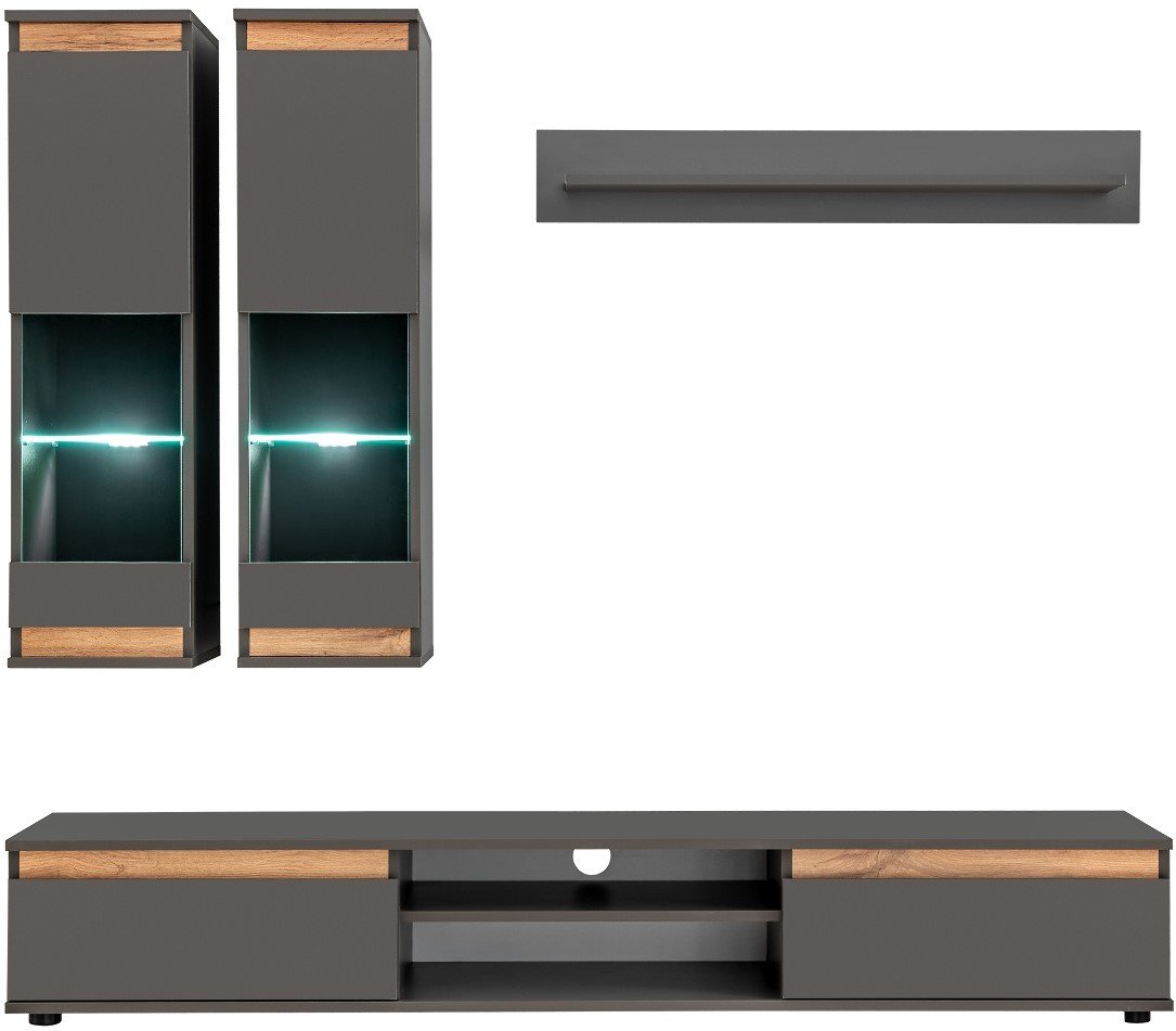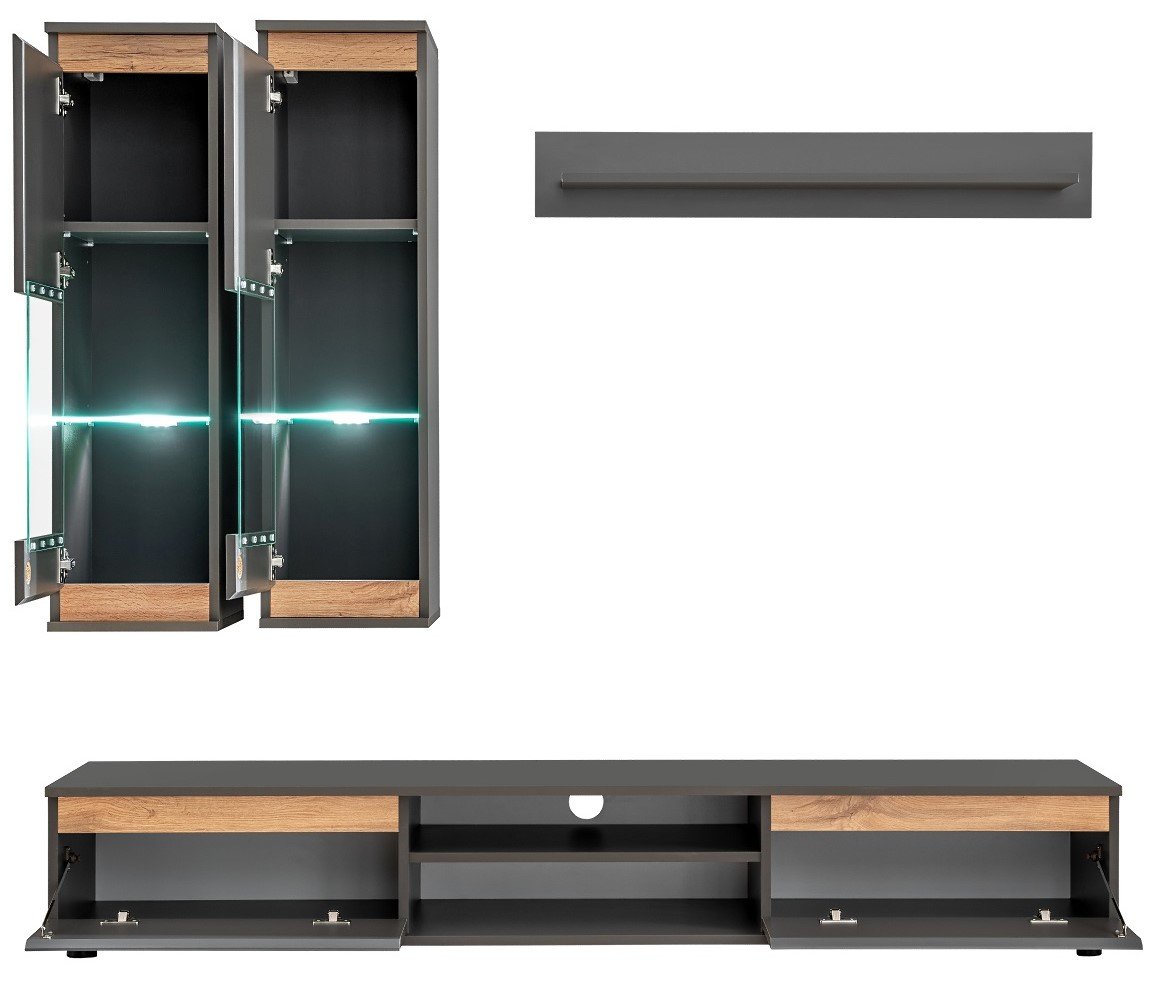 Το σύνθετο σαλονιού Musa προσδίδει μοντέρνο στυλ και υψηλή αισθητική σε κάθε χώρο, χάρη στο διακριτικό σχεδιασμό του σε γκρίζους τόνους με νότες όψης καρυδιάς. Αποτελείται από μεγάλη βάση τηλεόρασης με δύο ιδιαίτερα ευρύχωρα συρτάρια και ελεύθερο αποθηκευτικό χώρο ανάμεσά τους με δύο επίπεδα. Διαθέτει επίσης δύο επίτοιχα ντουλάπια με δύο ράφια στο εσωτερικό τους, καθώς και ένα κρεμαστό ράφι.