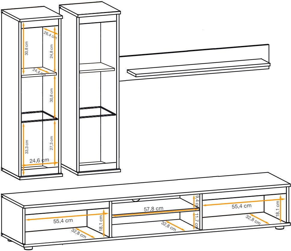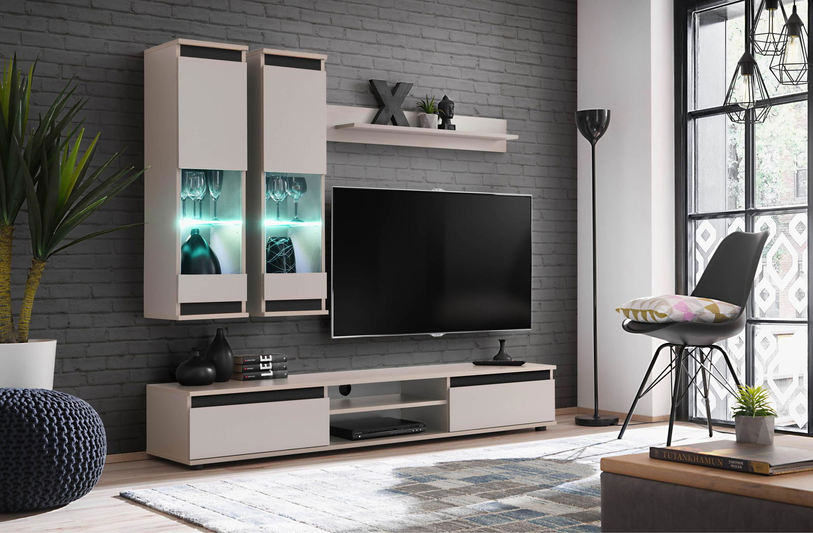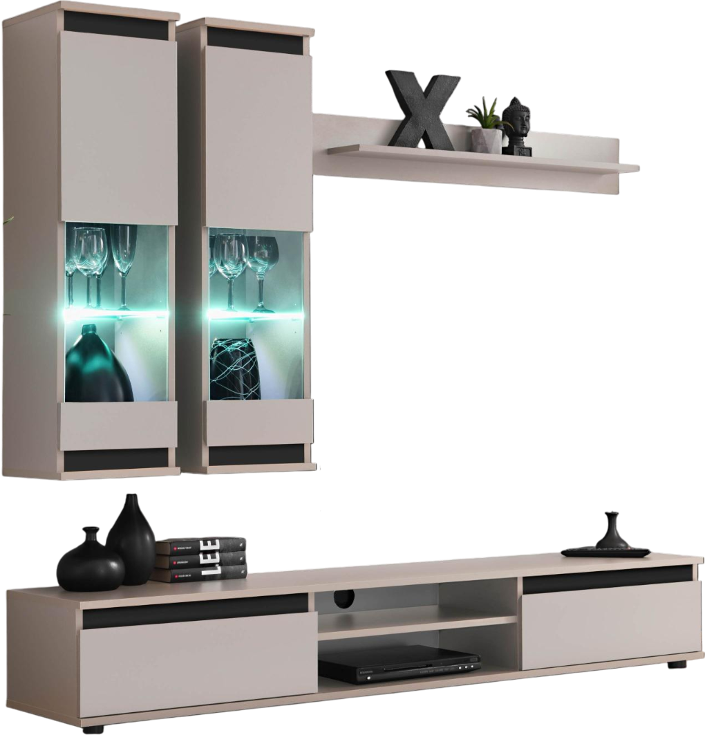 Το σύνθετο σαλονιού Musa προσδίδει μοντέρνο στυλ και υψηλή αισθητική σε κάθε χώρο, χάρη στο διακριτικό σχεδιασμό του σε γκρίζους τόνους με νότες όψης καρυδιάς. Αποτελείται από μεγάλη βάση τηλεόρασης με δύο ιδιαίτερα ευρύχωρα συρτάρια και ελεύθερο αποθηκευτικό χώρο ανάμεσά τους με δύο επίπεδα. Διαθέτει επίσης δύο επίτοιχα ντουλάπια με δύο ράφια στο εσωτερικό τους, καθώς και ένα κρεμαστό ράφι.