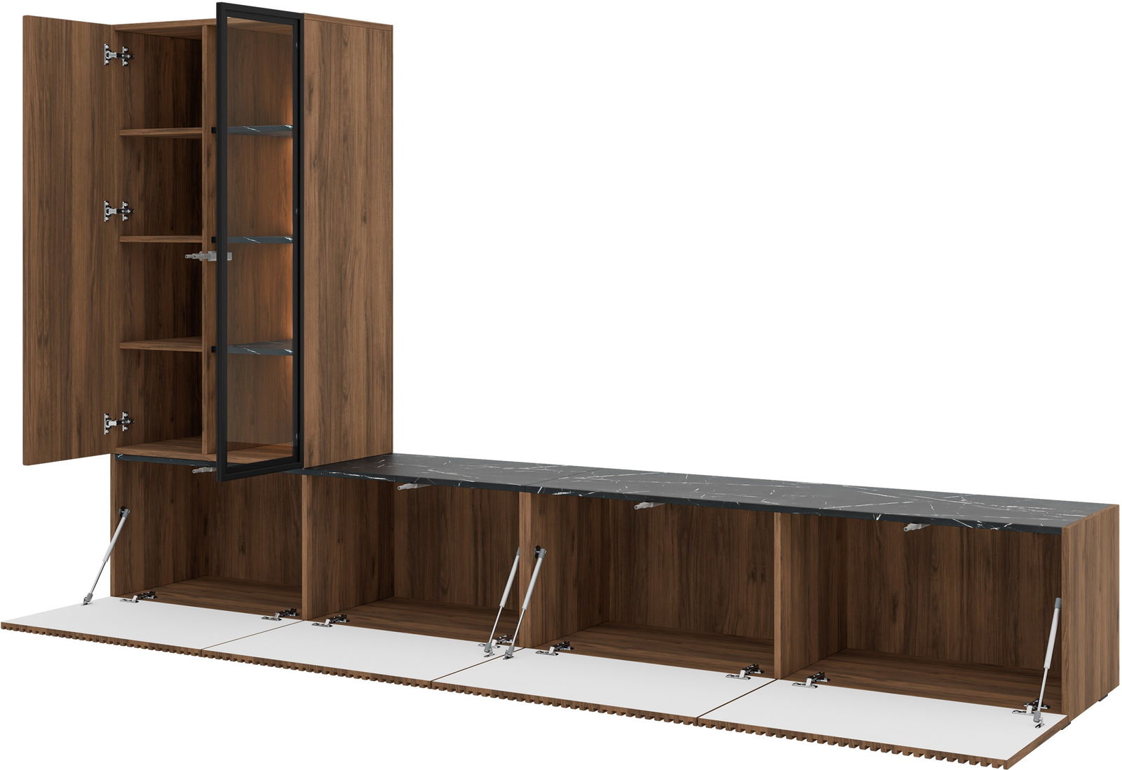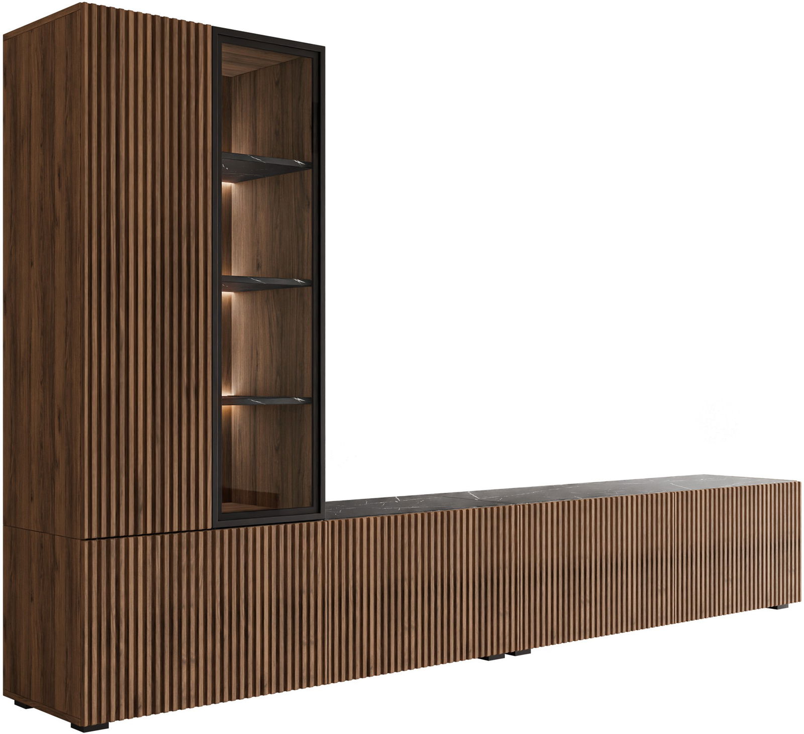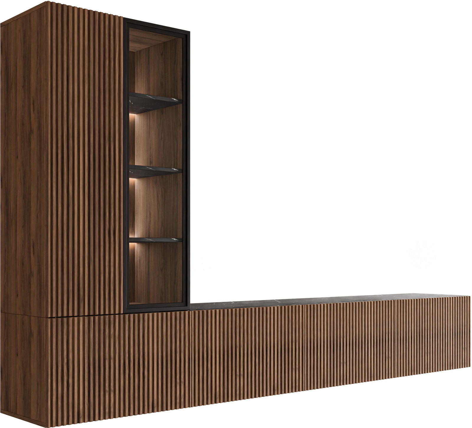 Το σύνθετο σαλονιού Tiwori αποτελεί μια κορυφαία πρόταση μοντέρνου σχεδιασμού, που συνδυάζει την πολυτέλεια του ξύλου με σύγχρονες ανάγλυφες επιφάνειες και industrial λεπτομέρειες. Ο ευέλικτος σχεδιασμός επιτρέπει την εγκατάσταση τόσο σε κρεμαστή όσο και σε επιδαπέδια τοποθέτηση.