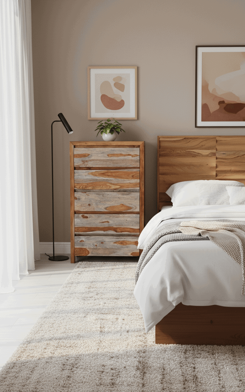 Η συρταριέρα Junia συνδυάζει απλότητα και πρακτικότητα, με λιτή γεωμετρία και πέντε ευρύχωρα συρτάρια. Η ανοιχτή καφέ απόχρωση και τα έντονα νερά του ξύλου sheesham αναδεικνύουν τη φυσική της ταυτότητα.