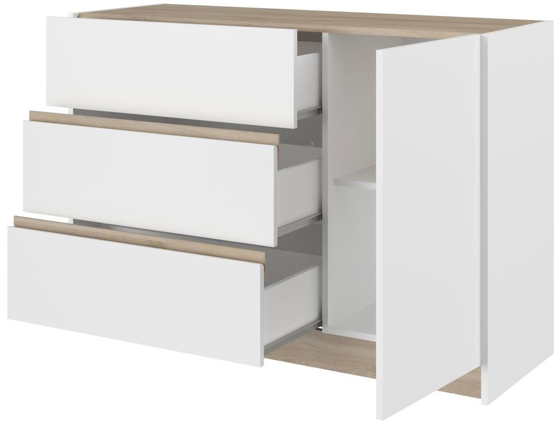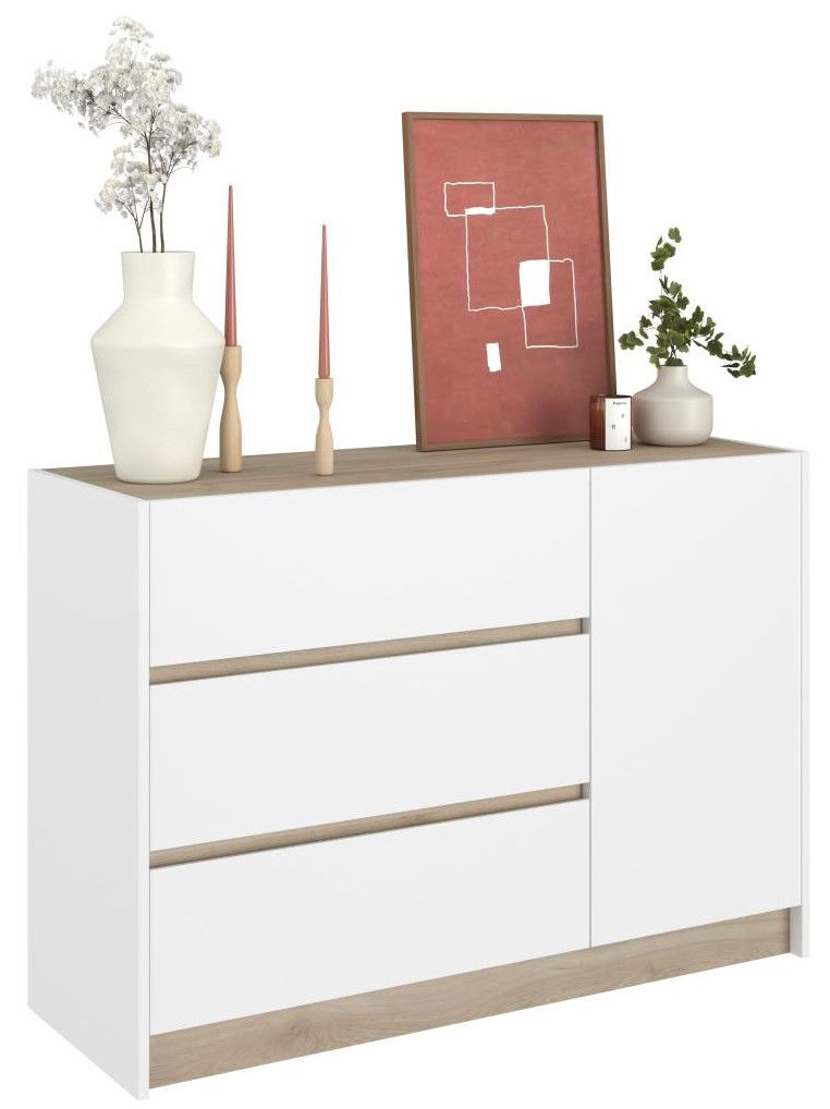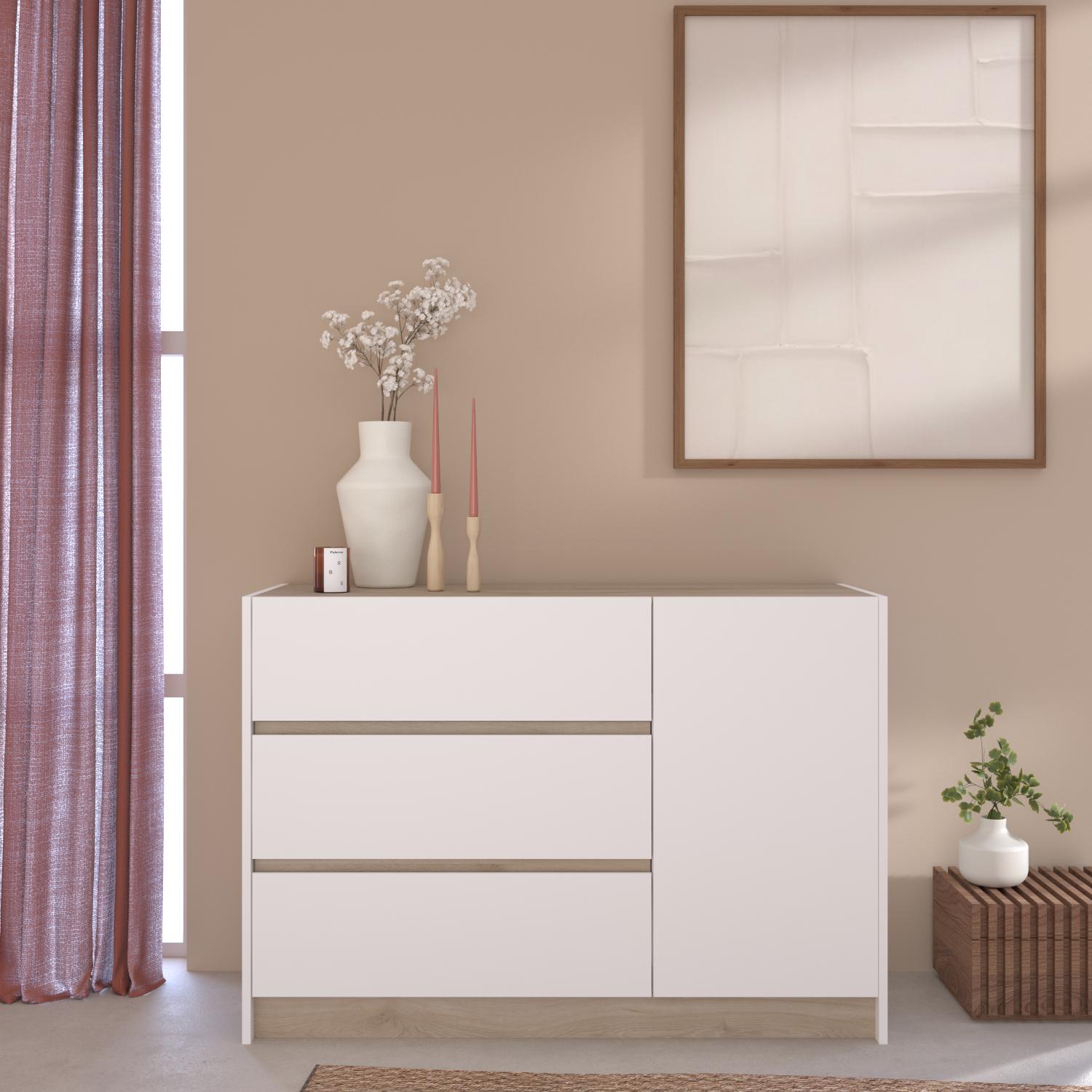 Η κομψή και μοντέρνα συρταριέρα Peonia είναι η τέλεια προσθήκη σε κάθε σύγχρονο υπνοδωμάτιο. Ο μινιμαλιστικός σχεδιασμός και οι καθαρές γραμμές δημιουργούν ένα κομψό και λειτουργικό κομμάτι. Ο συνδυασμός λευκού και ξύλινου φινιρίσματος προσθέτει μια πινελιά ζεστασιάς και εκλέπτυνσης.