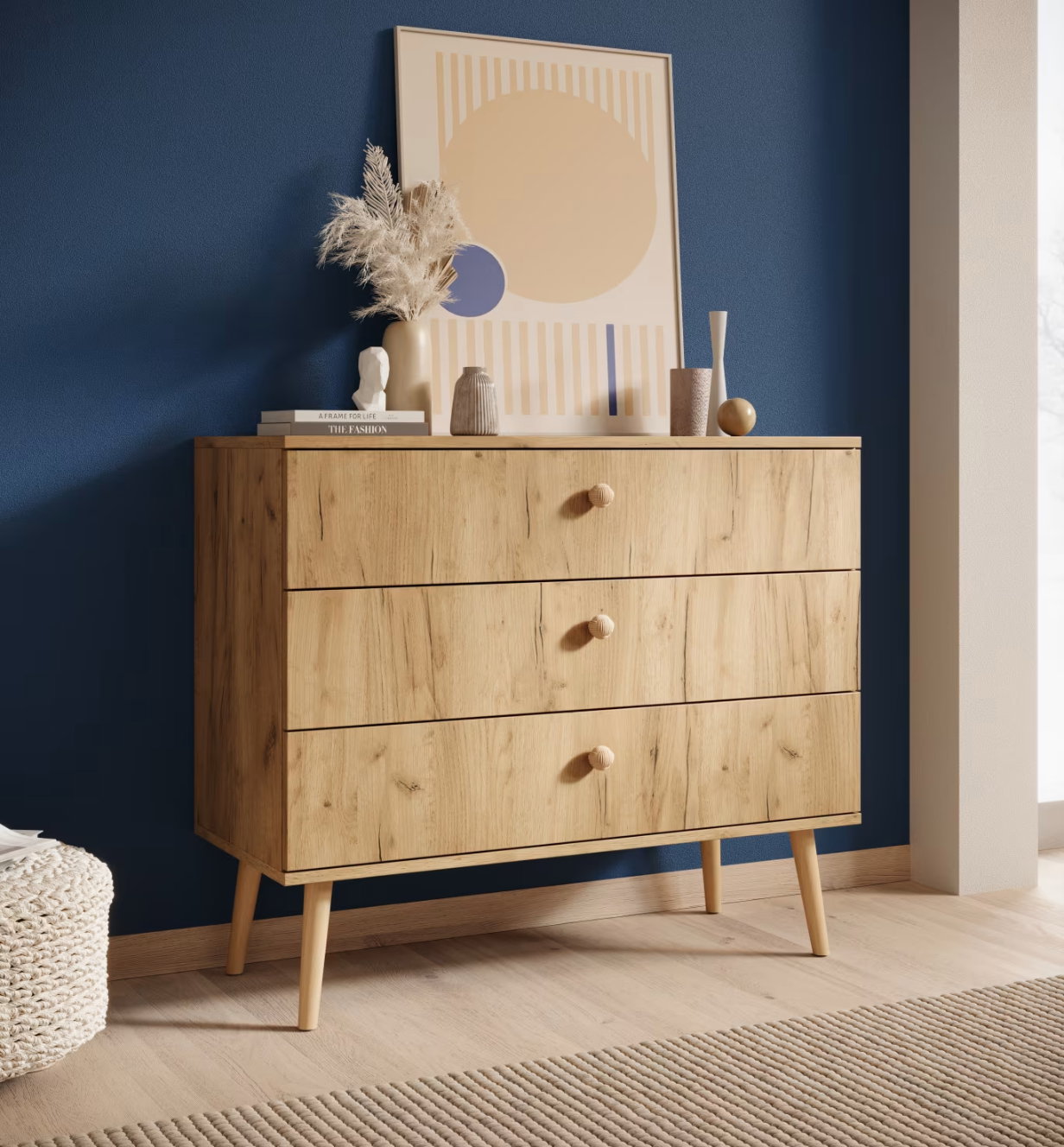 Η γοητευτική συρταριέρα φέρνει μια πινελιά μοντέρνου στυλ σε κάθε υπνοδωμάτιο. Οι απαλοί τόνοι της προσθέτουν μια πινελιά κομψότητας, ενώ τα κωνικά ξύλινα πόδια προσφέρουν μια ρετρό πινελιά.