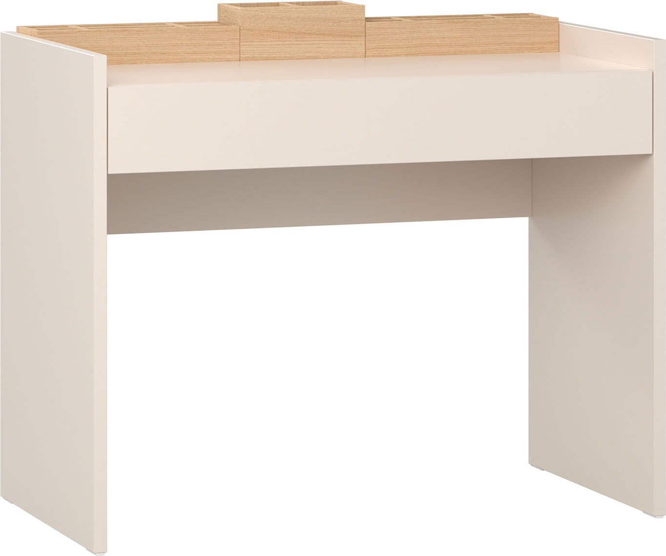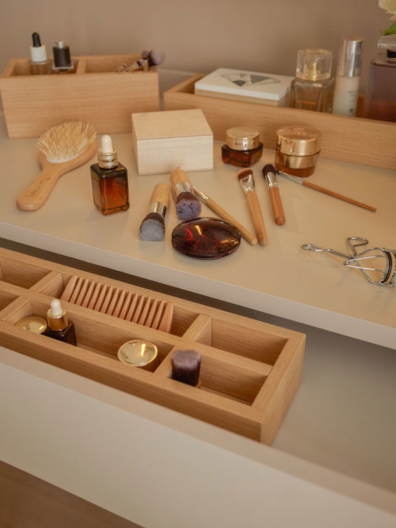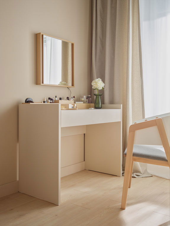 Με την τουαλέτα 4 You Fresh μπορείτε εύκολα να διαμορφώσετε μια πρακτική γωνιά ομορφιάς, καθώς εντυπωσιάζει όχι μόνο με τη μορφή της, αλλά και με τη λειτουργικότητά της. Στο επάνω μέρος του κομοδίνου υπάρχουν λειτουργικές εργαλειοθήκες – δύο χαμηλές και μία ψηλή. Για να κάνετε τον πάγκο ακόμα πιο τακτοποιημένο, οι χαμηλές εργαλειοθήκες μπορούν να κρυφτούν μέσα στο συρτάρι. Ακόμα η επιφάνεια του τραπεζιού στις άκρες είναι υπερυψωμένη ώστε να μην γλιστράν τα καλλυντικά.