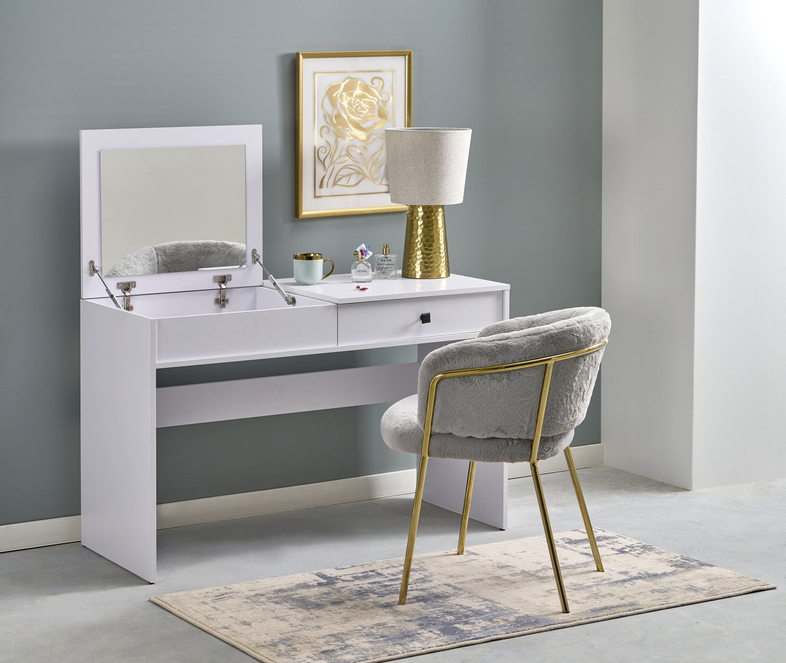 Η τουαλέτα Meggie είναι ένα κομψό και λειτουργικό έπιπλο υπνοδωματίου που συνδυάζει την αισθητική με την πρακτικότητα. Με τον ευρύχωρο πάγκο της, προσφέρει άπλετο χώρο για τα καλλυντικά σας, τα αρώματα και τα κοσμήματά σας. Οι κρυφοί αποθηκευτικοί χώροι σας επιτρέπουν να κρατάτε τα διάφορα αξεσουάρ οργανωμένα. Ο σύγχρονος σχεδιασμός της και τα ποιοτικά υλικά κατασκευής την καθιστούν ένα διαχρονικό κομμάτι που θα αναβαθμίσει την αισθητική της κρεβατοκάμαράς σας.