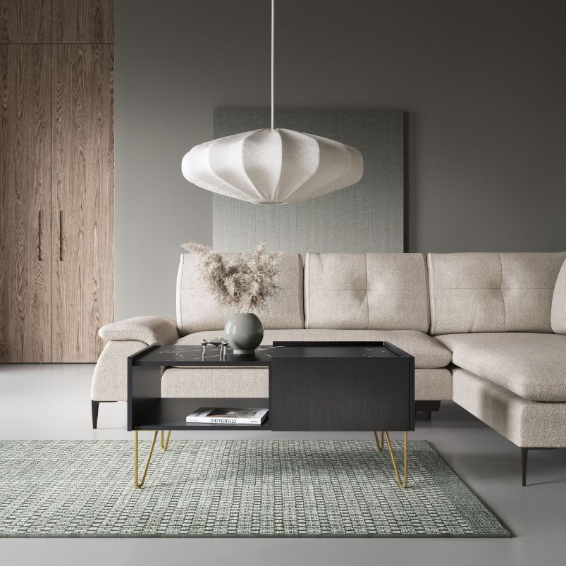 Τραπεζάκι σαλονιού Armony, μια εξαιρετική επιλογή για να ανανεώσετε το καθιστικό σας και να αναβαθμίσετε την αισθητική του χώρου. Τα χρυσά πόδια του προσθέτουν κομψότητα και αυξάνουν το κύρος. Η πάνω επιφάνεια του έχει όψη μαρμάρου, κάνοντας το έπιπλο ακόμα πιο εντυπωσιακό. Σίγουρα θα κλέψει τις εντυπώσεις και θα κεντρίσει το ενδιαφέρον των επισκεπτών σας. Συνδυάστε το με τα υπόλοιπα έπιπλα της σειράς για ένα ολοκληρωμένο αποτέλεσμα διακόσμησης.