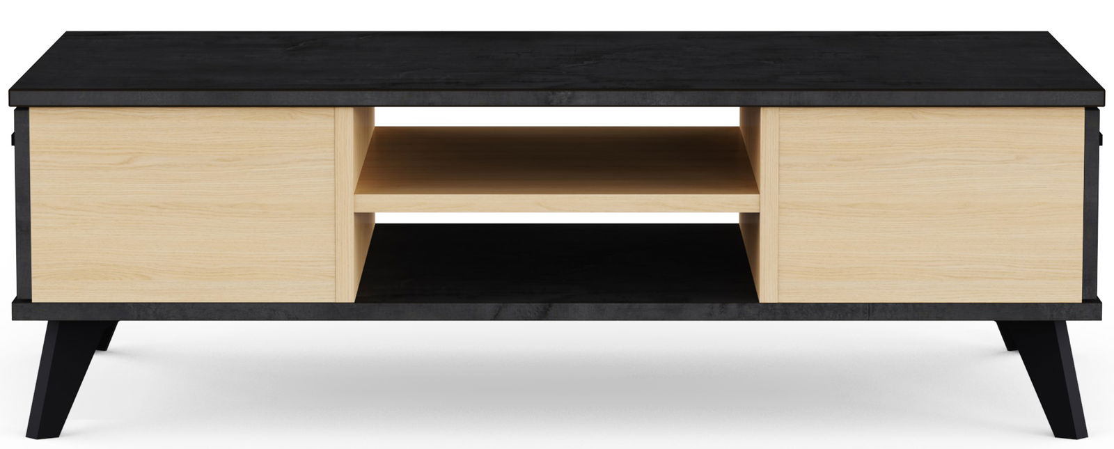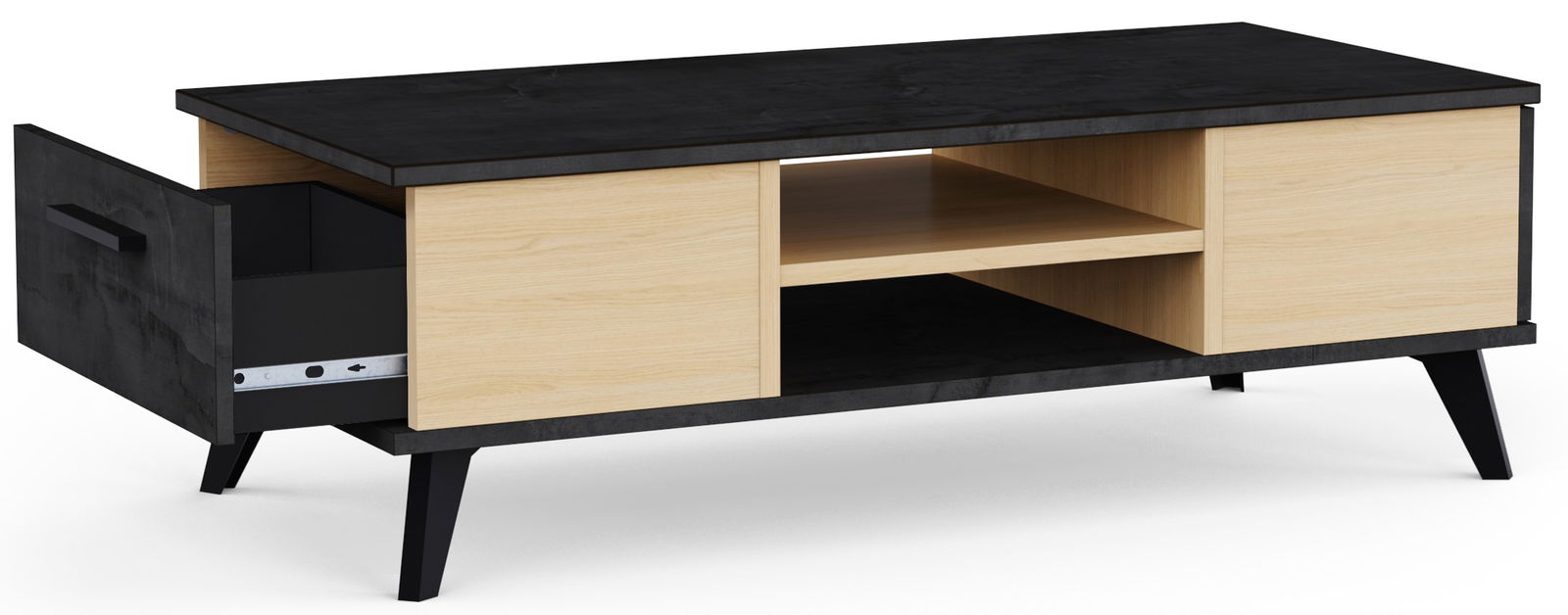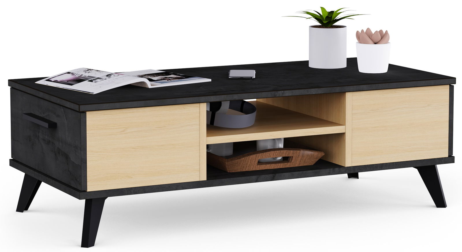 Προσθέστε μια πινελιά σύγχρονου στυλ και λειτουργικότητας στο σαλόνι σας με το εντυπωσιακό τραπεζάκι σαλονιού Clark. Διαθέτοντας ένα μοναδικό σχέδιο με αντίθετες ανοιχτόχρωμες ξύλινες πόρτες και σκουρόχρωμο πλαίσιο με υφή, αυτό το κομμάτι προσφέρει τόσο μια κομψή επιφάνεια όσο και πρακτικές λύσεις αποθήκευσης.