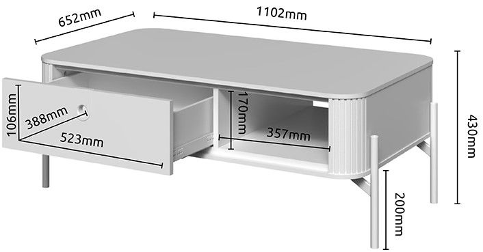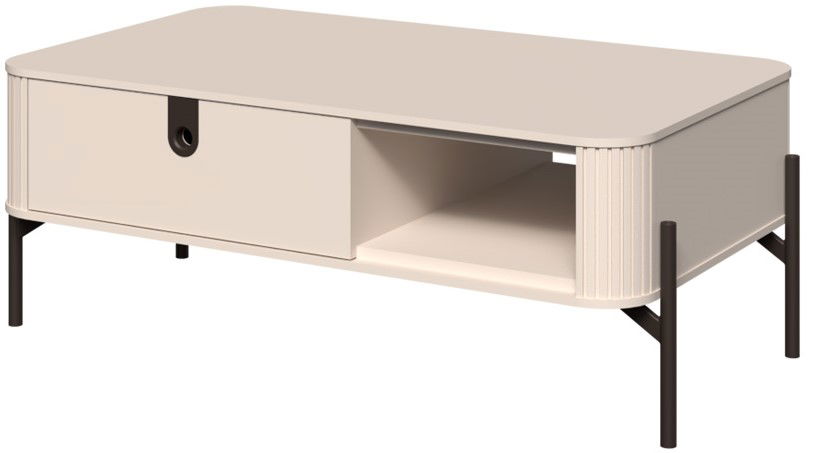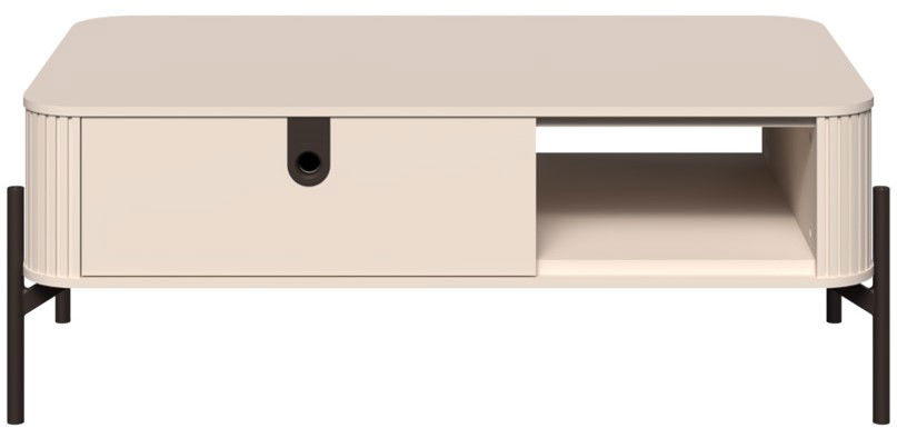 Το σύγχρονο τραπεζάκι σαλονιού Dutchess είναι μια κομψή και λειτουργική προσθήκη σε κάθε σαλόνι. Η μοναδική λεπτομέρεια με υφή στο μπροστινό μέρος δημιουργεί μια οπτικά ελκυστική και εντυπωσιακή εμφάνιση, ενώ η κομψή σιλουέτα προσθέτει μια πινελιά εκλεπτυσμού. Ο συνδυασμός ενός ανοιχτού ραφιού και ενός συρταριού παρέχει άφθονο χώρο αποθήκευσης για τηλεχειριστήρια, βιβλία ή άλλα απαραίτητα αντικείμενα του καθιστικού.