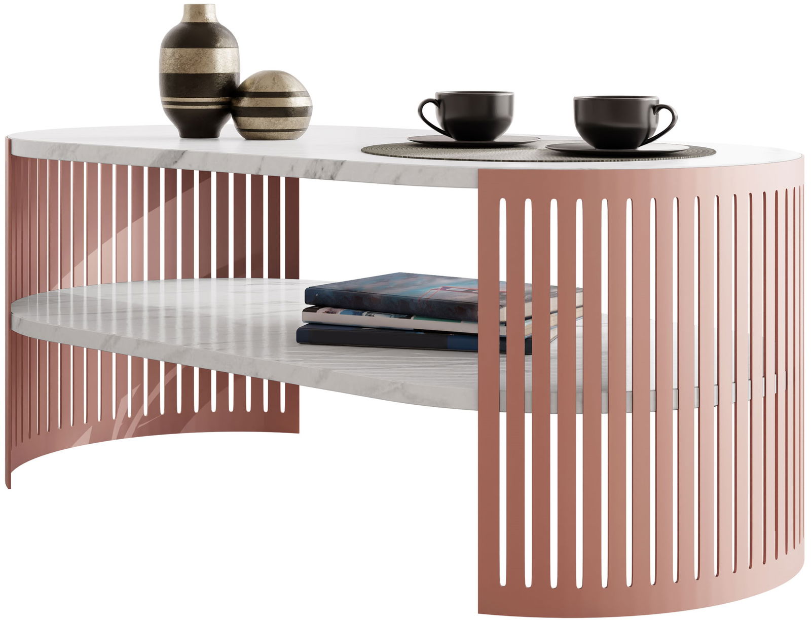 Το λαμπερό και κομψό τραπεζάκι σαλονιού Fikoli Ember I είναι ένα statement κομμάτι για κάθε μοντέρνο σαλόνι. Το μοναδικό οβάλ σχήμα και οι κάθετες ροζ πινελιές δημιουργούν μια οπτικά ελκυστική και εντυπωσιακή εμφάνιση.