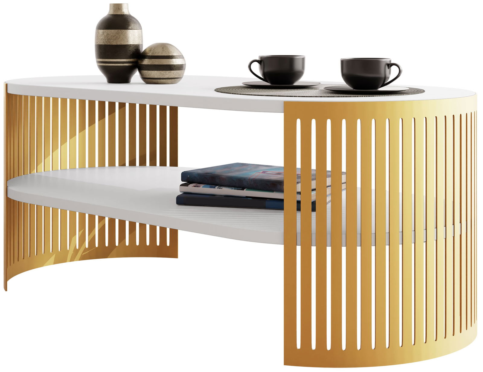 Το λαμπερό κομψό τραπεζάκι σαλονιού Fikoli GD I είναι ένα statement κομμάτι για κάθε μοντέρνο σαλόνι. Το μοναδικό οβάλ σχήμα και οι κάθετες χρυσές πινελιές δημιουργούν μια οπτικά ελκυστική και εντυπωσιακή εμφάνιση.