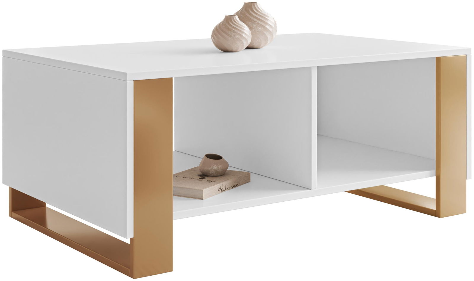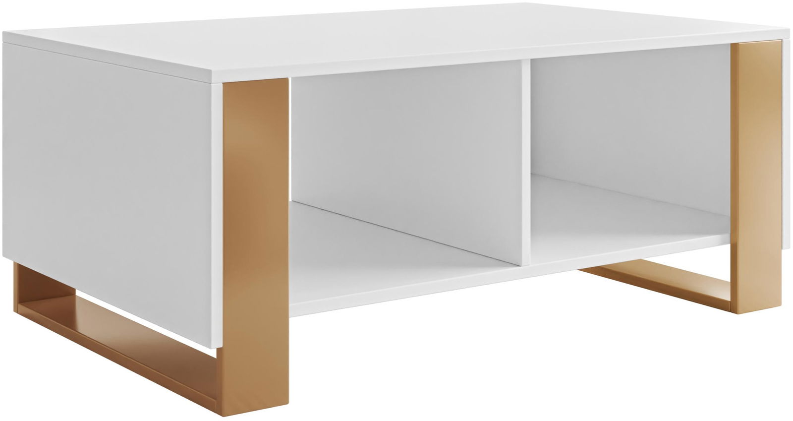 Το τραπεζάκι σαλονιού Loutio συνδυάζει κομψότητα και λειτουργικότητα. Με λευκή επιφάνεια και χρυσές λεπτομέρειες στα πόδια, προσφέρει μοντέρνα αισθητική. Διαθέτει ευρύχωρη επιφάνεια για διακόσμηση ή ροφήματα, καθώς και δύο πρακτικά ράφια για βιβλία ή περιοδικά, ιδανικό για σύγχρονα σαλόνια.
