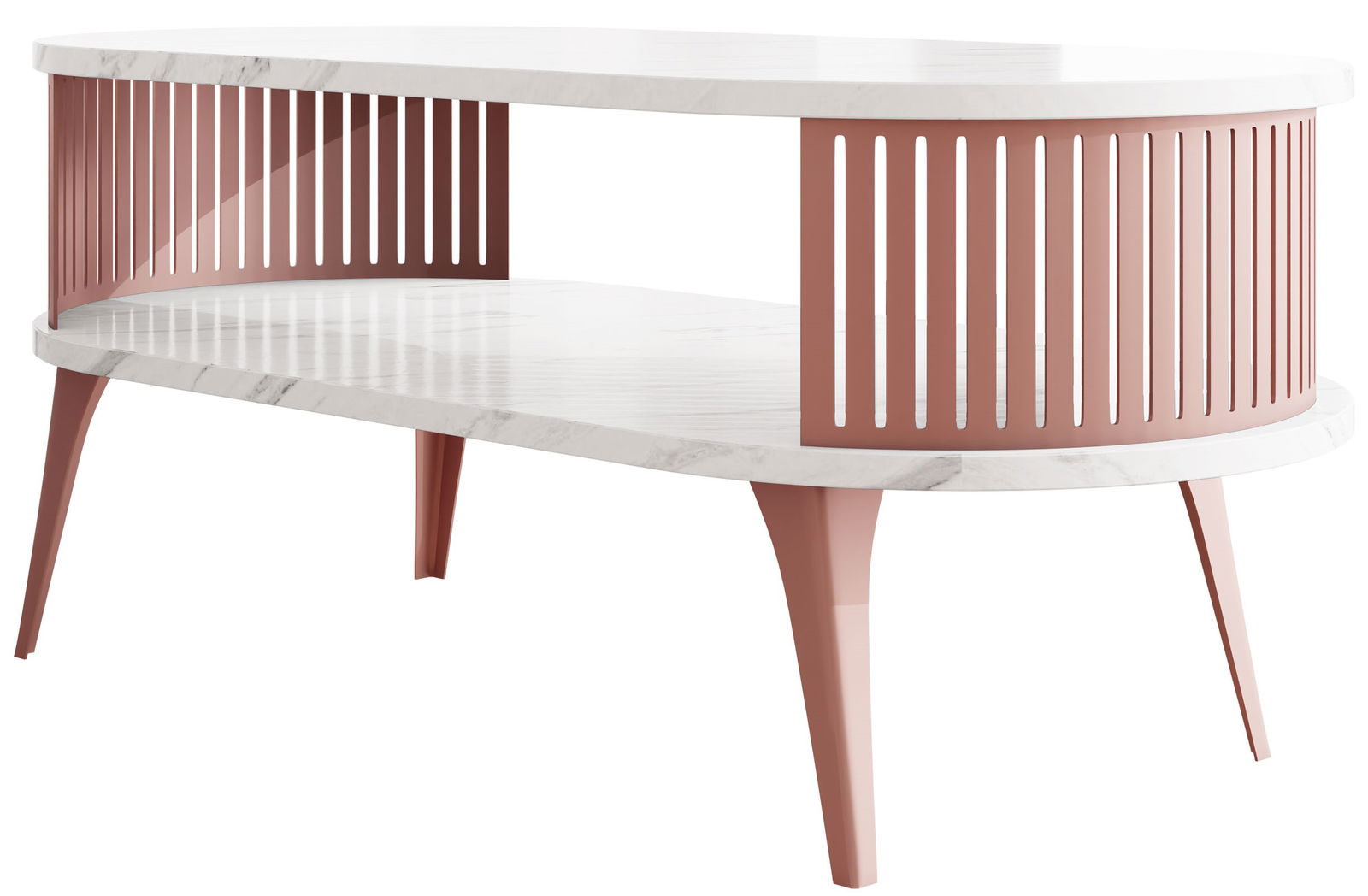 Το λαμπερό τραπεζάκι σαλονιού Roenni Ember προσθέτει μια πινελιά πολυτέλειας σε κάθε σαλόνι. Η κομψή επιφάνεια του τραπεζιού έρχεται σε υπέροχη αντίθεση με τις ζεστές ροζ πινελιές, δημιουργώντας μια εκλεπτυσμένη και κομψή εμφάνιση. Ο μοναδικός σχεδιασμός με τα κάθετα πηχάκια προσθέτει μια πινελιά οπτικού ενδιαφέροντος.