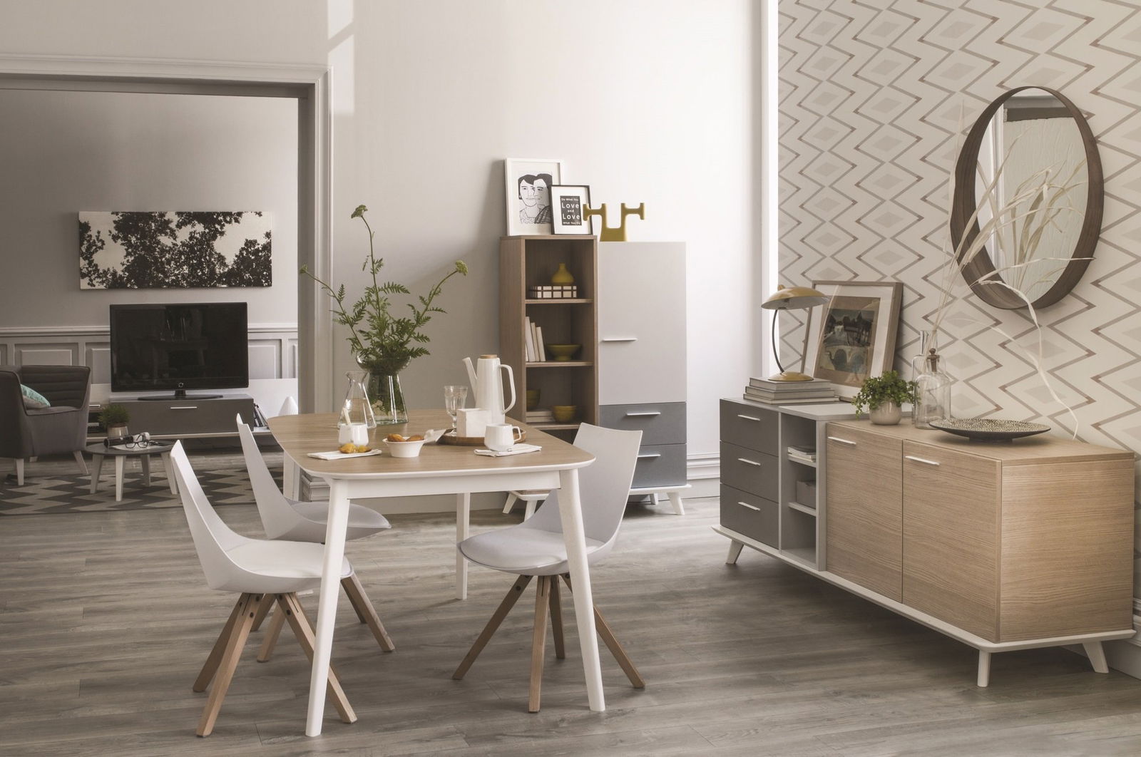 Επεκτεινόμενο τραπέζι Bello σε Φυσικό χρώμα και πόδια σε λευκό λακαριστό μασίφ ξύλο.