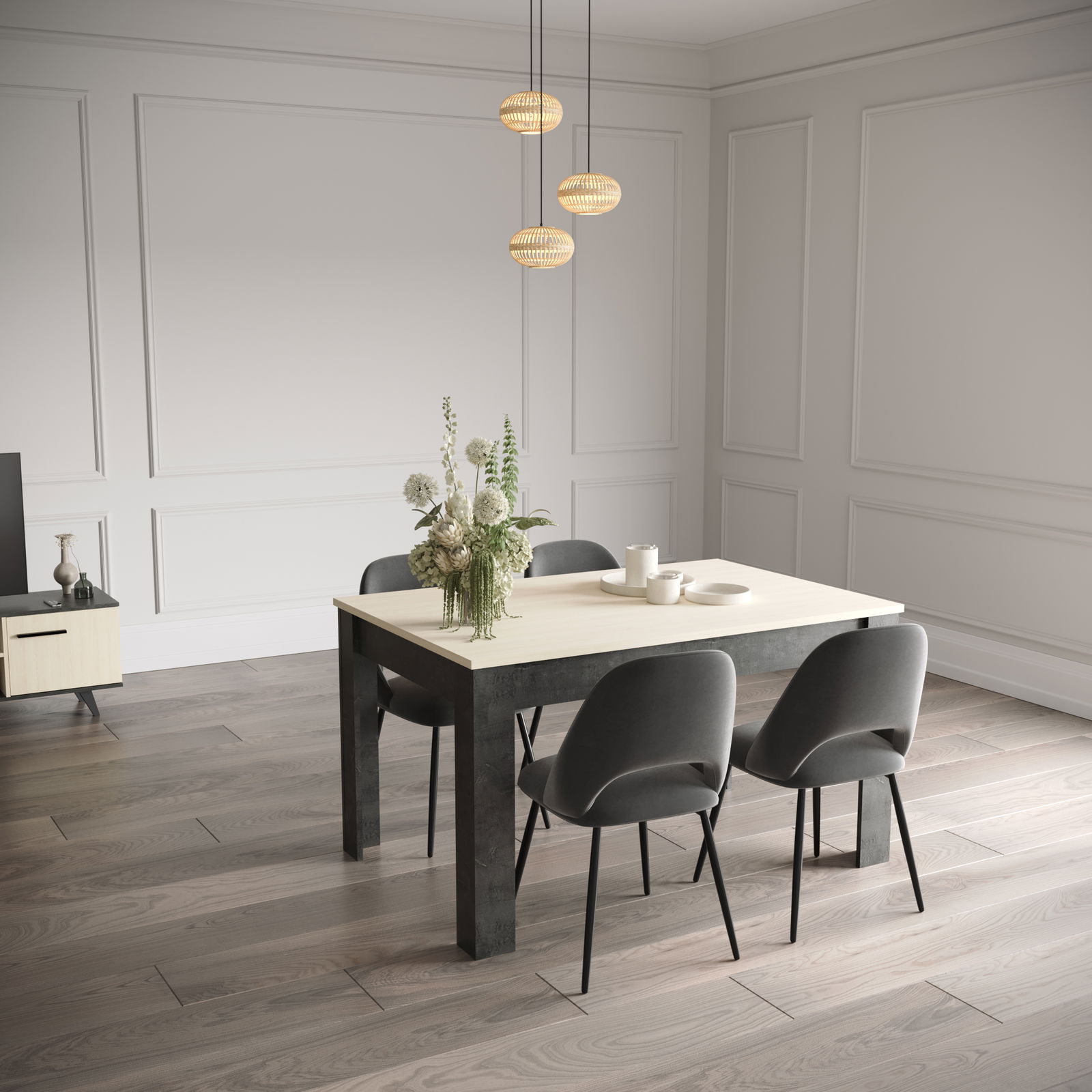 Προσθέστε μια πινελιά σύγχρονης ατμόσφαιρας στην τραπεζαρία σας με το κομψό τραπέζι Clark. Διαθέτοντας ένα μοναδικό σχέδιο με ανοιχτόχρωμη επιφάνεια τραπεζιού και σκούρα πόδια με σκουρόχρωμη υφή, αυτό το τραπέζι φιλοξενεί άνετα τέσσερα άτομα και είναι ιδανικό για καθημερινά γεύματα ή περιστασιακές συγκεντρώσεις. Συνδυάστε το προϊόν και με τα υπόλοιπα της σειράς Clark.