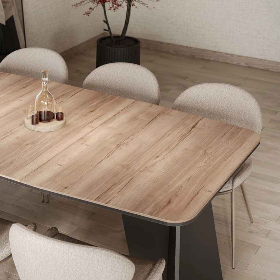 Τραπέζι Moneto σύγχρονου σχεδιασμού, με καθαρές γραμμές και ισορροπημένη αισθητική που προσαρμόζεται εύκολα σε κάθε χώρο. Διαθέτει μηχανισμό επέκτασης που προσφέρει επιπλέον ευελιξία, καλύπτοντας εύκολα διαφορετικές ανάγκες φιλοξενίας. Η μεγάλη επιφάνειά του εξασφαλίζει άνεση και πρακτικότητα στην καθημερινή χρήση, ενώ παραμένει ιδανικό και για μεγαλύτερες συγκεντρώσεις, συνδυάζοντας λειτουργικότητα και διαχρονική κομψότητα.