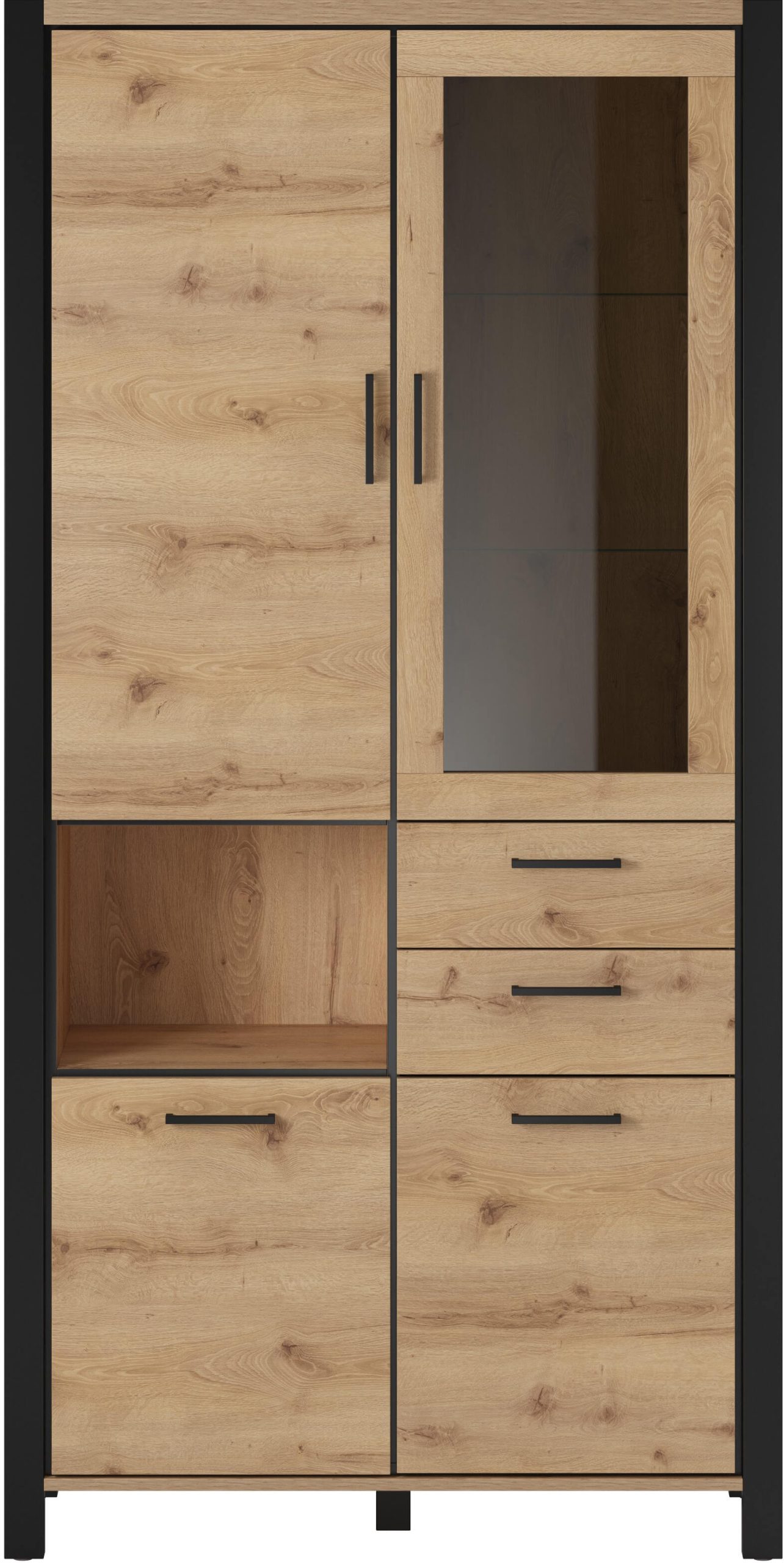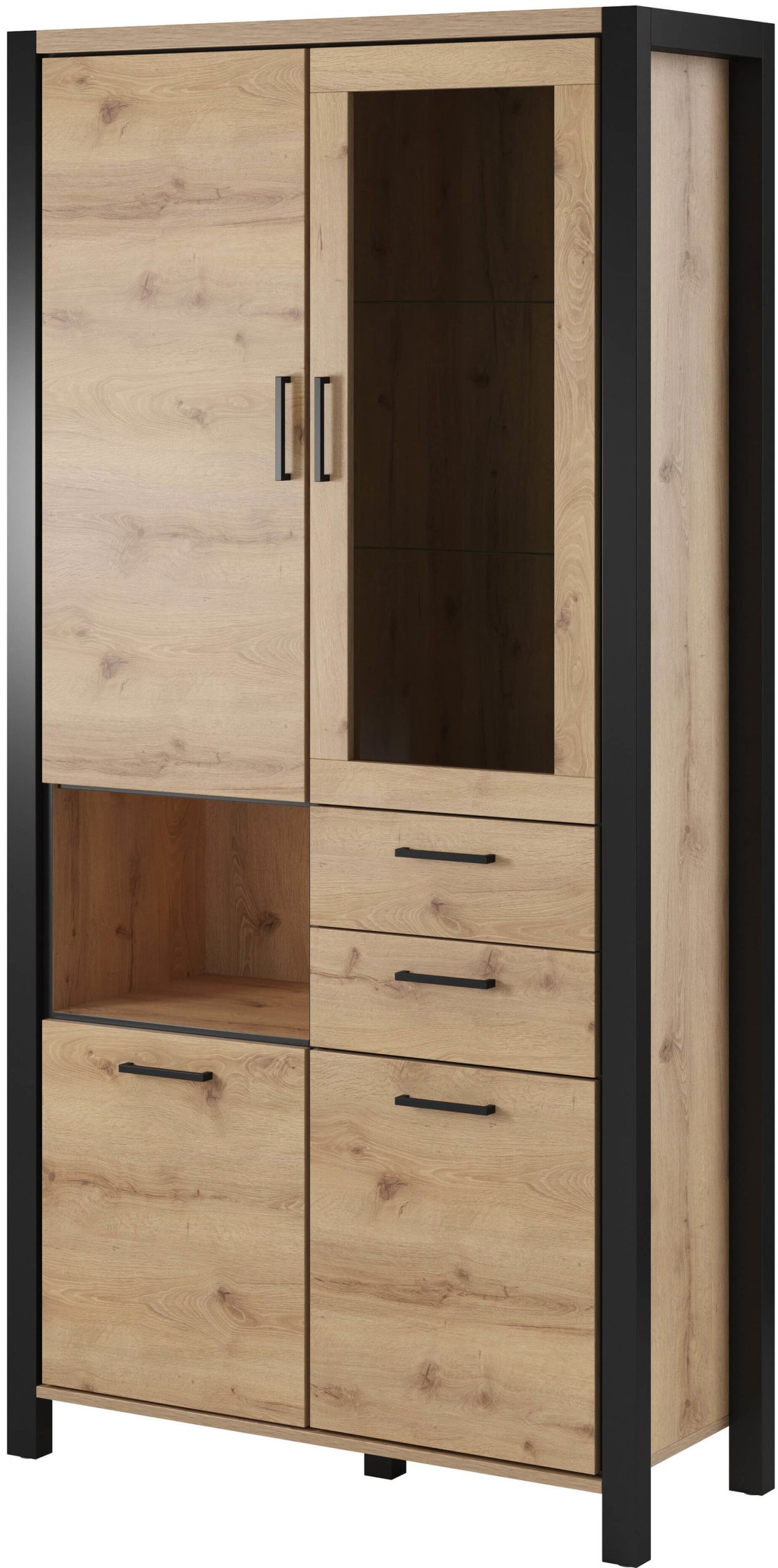 Βιτρίνα Amelie 4D2S σε μοντέρνο, industrial σχεδιασμό. Είναι σίγουρο πως θα ανανεώσετε τον χώρο σας, προσδίδοντας του μια κομψή νότα, χάρις τις μαύρες λεπτομέρειες και την γυάλινη πρόσοψη. Διαθέτει πρακτικές διαστάσεις και άπλετο αποθηκευτικό χώρο που την καθιστούν ιδανική επιλογή για κάθε σαλόνι.