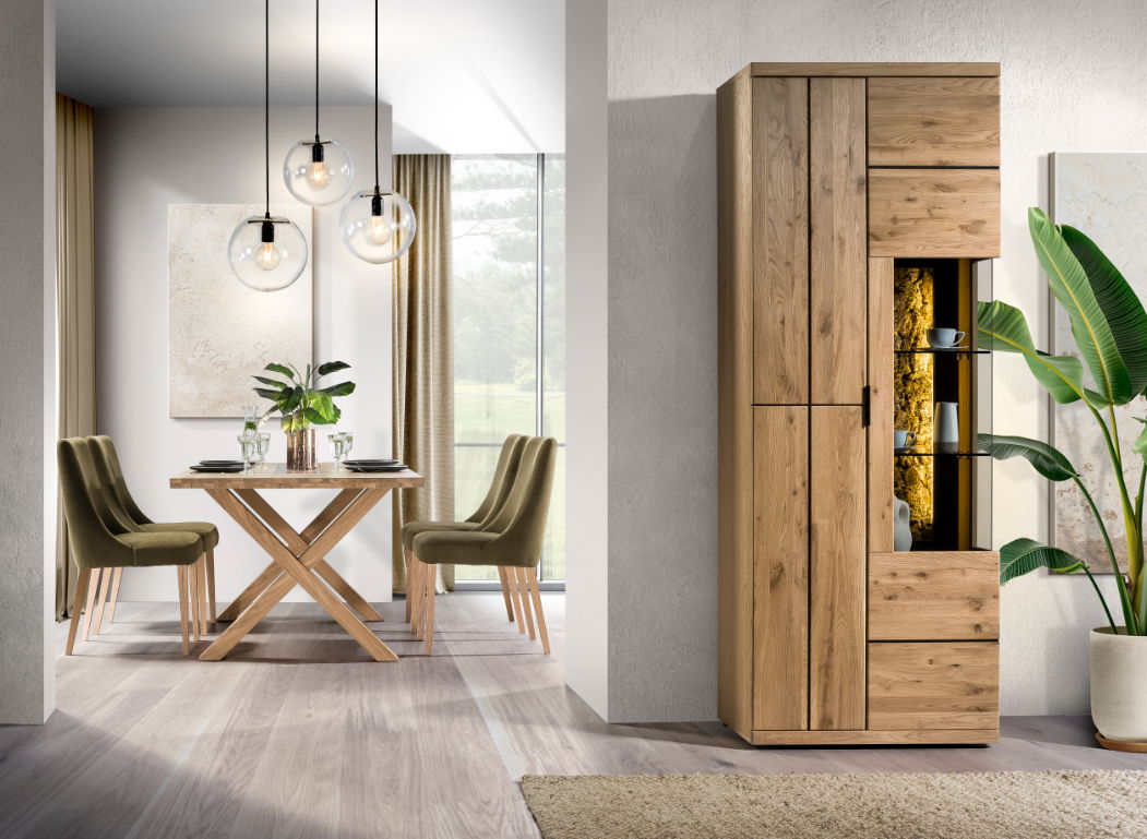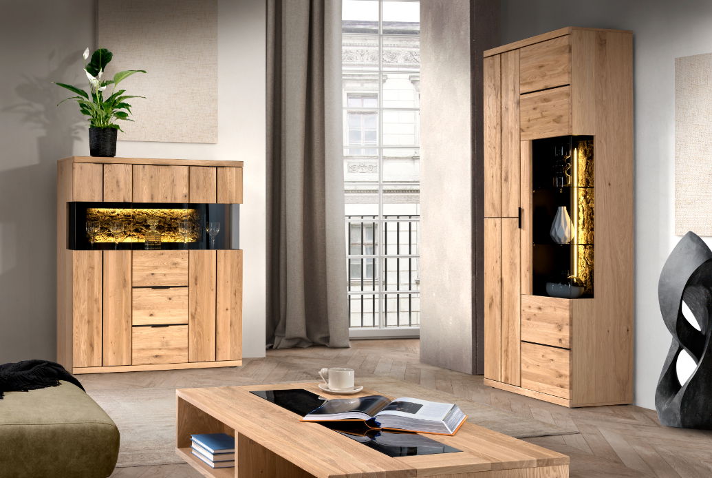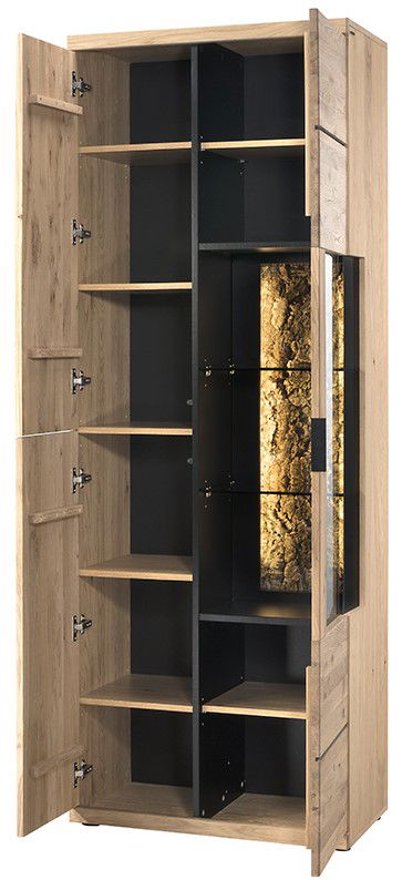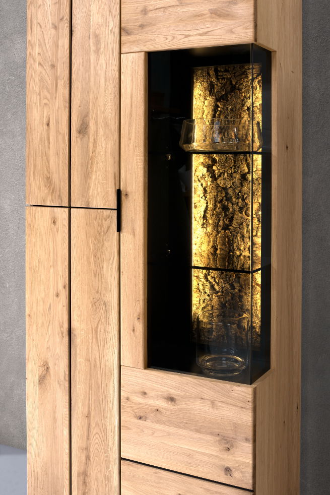 Αναβαθμίστε τη διακόσμηση του σπιτιού σας με την κομψή και λειτουργική βιτρίνα Campania. Κατασκευασμένη από ξύλο δρυός υψηλής ποιότητας, αυτό το κομμάτι αποπνέει διαχρονική κομψότητα και ζεστασιά. Αυτό που κάνει την βιτρίνα Campania να διαφέρει είναι το εντυπωσιακό κομμάτι ξύλου που φωταγωγείται πρόσθετωντας μια αίσθηση εκλεπτυσμού.