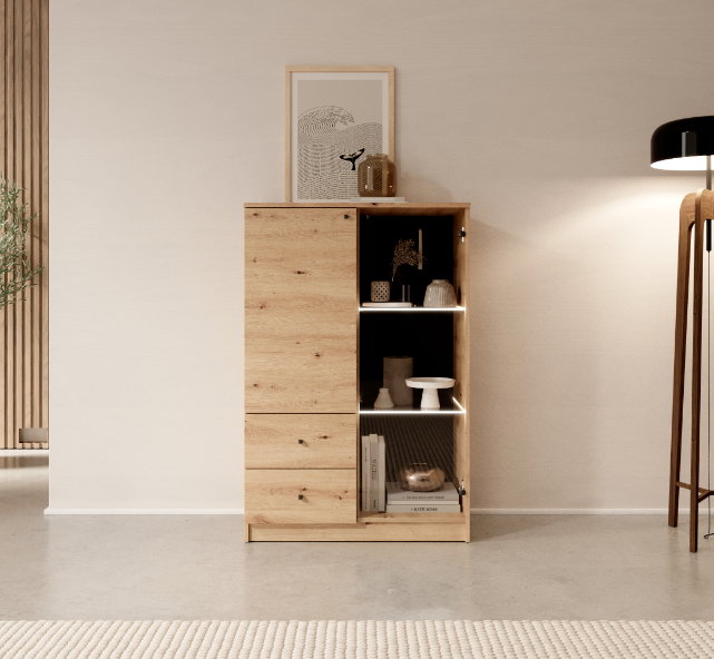 Η βιτρίνα Liva είναι κάτι περισσότερο από ένα απλό έπιπλο. Είναι ένας καμβάς όπου εκθέτεις τα αγαπημένα σου αντικείμενα, δημιουργώντας μια μοναδική ατμόσφαιρα στο χώρο σου. Με τον κομψό σχεδιασμό της και τα ξύλινα ράφια, η Liva αναδεικνύει κάθε λεπτομέρεια, από τα συλλεκτικά σου αντικείμενα μέχρι τα διακοσμητικά σου στοιχεία. Επέλεξε Liva και δώσε στο σπίτι σου μια νότα πολυτέλειας και αισθητικής .