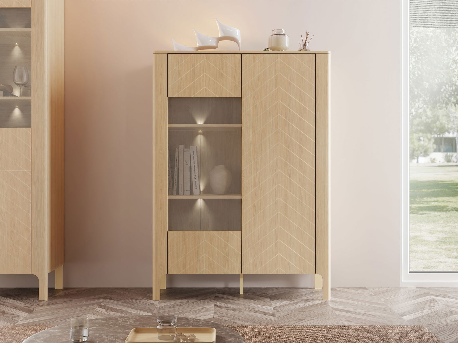 Ένας εξαιρετικός τρόπος για να διακοσμήσετε έναν κομψό εσωτερικό χώρο είναι να τον εξοπλίσετε με τη χαμηλή βιτρίνα Malumi ML03. Το ουδέτερο χρωματικό σχέδιο αυτού του κομματιού εναρμονίζεται τέλεια με πολλά στυλ εσωτερικής διακόσμησης. Χάρη στο διακοσμητικό μοτίβο ψαροκόκαλο στις προσόψεις, η βιτρίνα προσθέτει επίσης χαρακτήρα στον εσωτερικό χώρο, αποτελώντας μέρος του σχεδιασμού του.