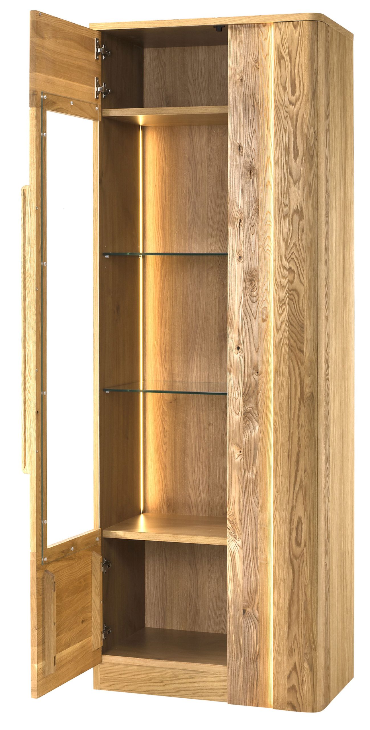 Αναβαθμίστε τη διακόσμηση του σπιτιού σας με αυτή την εκπληκτική Βιτρίνα Mayfair I. Κατασκευασμένη από εξαιρετικής ποιότητας ξύλο δρυός, αυτό το κομμάτι αποπνέει μια διαχρονική κομψότητα και ζεστασιά. Ο μοναδικός καμπυλωτός σχεδιασμός της βιτρίνας προσθέτει μια πινελιά εκλέπτυνσης, ενώ η γυάλινη πόρτα με φωτισμό LED αναδεικνύει όμορφα τα πολύτιμα υπάρχοντά σας.