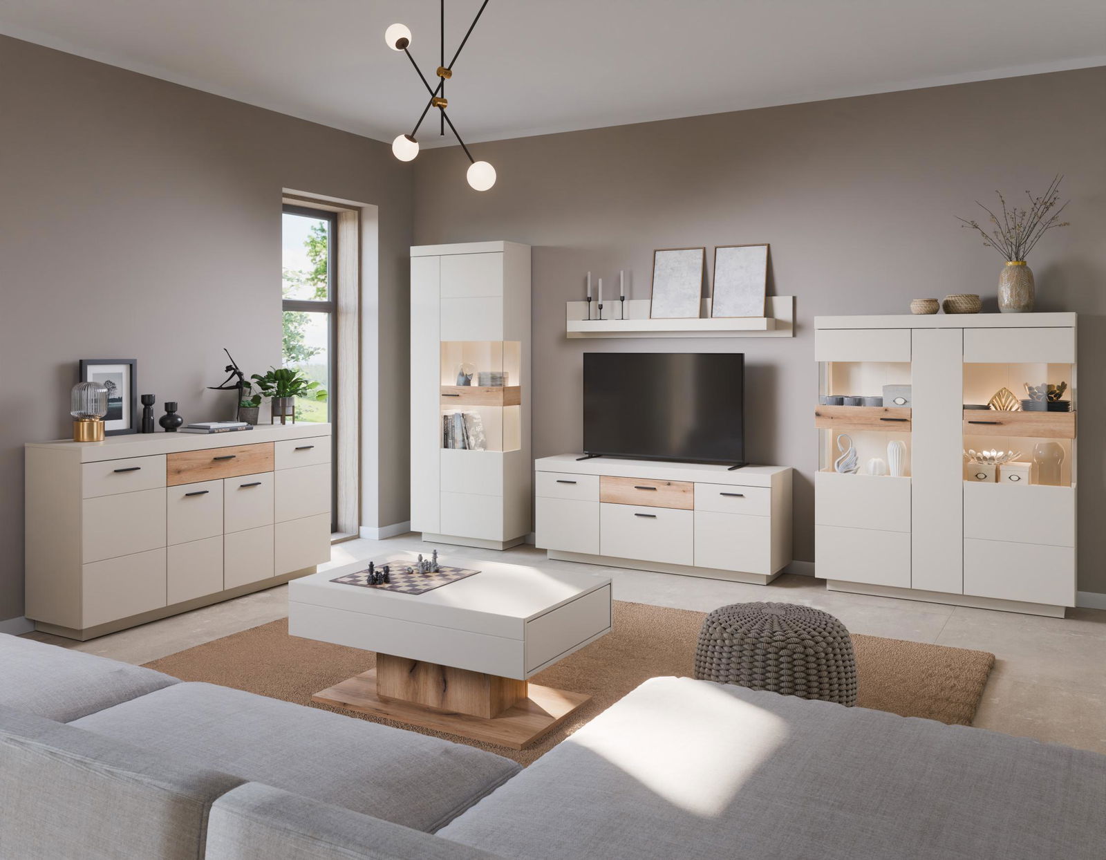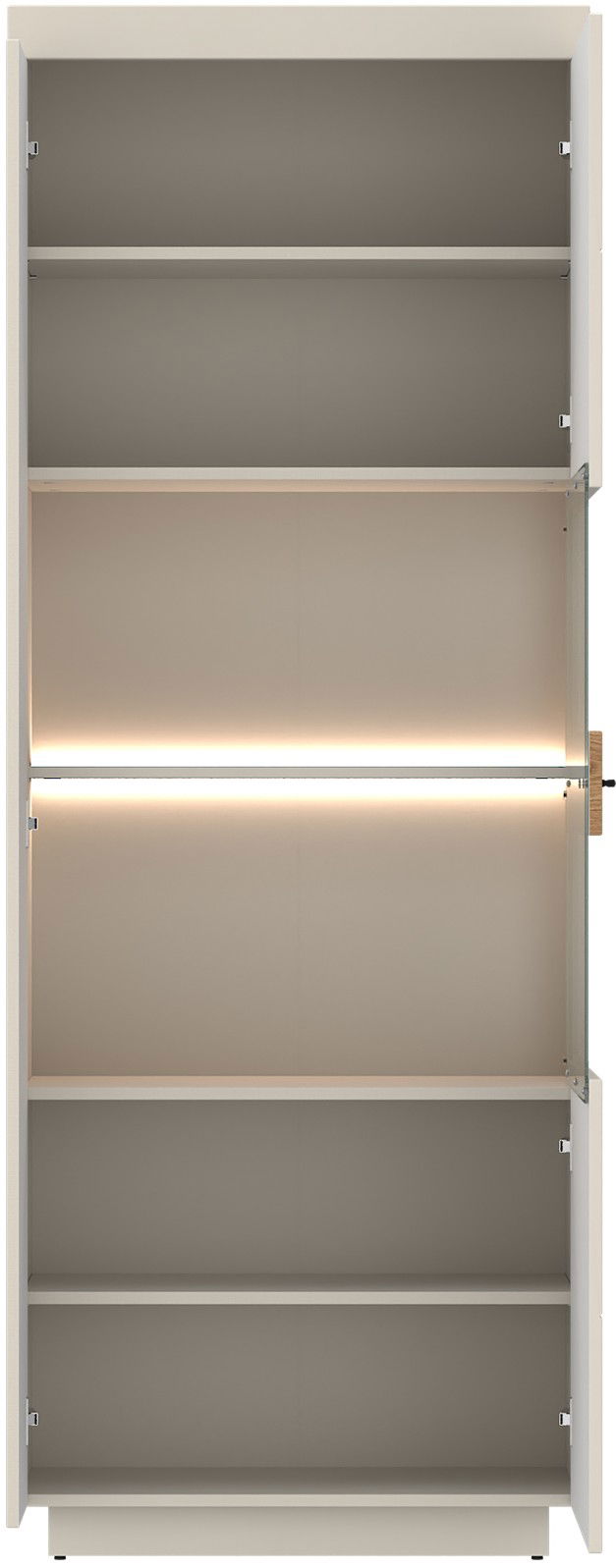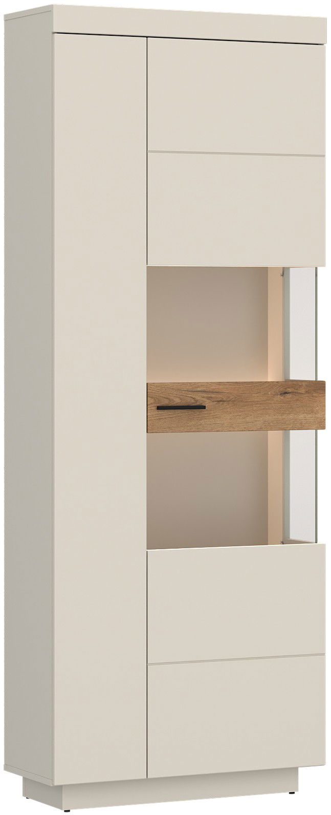 Η ψηλή βιτρίνα της σειράς Warmia αποτελεί ένα επιβλητικό έπιπλο που συνδυάζει την ανάγκη για κλειστή αποθήκευση με τη δυνατότητα προβολής αγαπημένων αντικειμένων μέσα από ένα σύγχρονο πρίσμα. Ο σχεδιασμός της ακολουθεί την αισθητική της συλλογής, δίνοντας έμφαση στις κάθετες γραμμές και τη γεωμετρική καθαρότητα.
