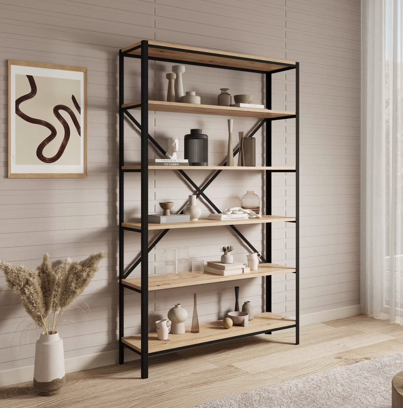 Η βιβλιοθήκη Renev II σε βιομηχανικό στιλ είναι ένα statement κομμάτι για κάθε μοντέρνο χώρο. Το κομψό μαύρο μεταλλικό πλαίσιο και τα στιβαρά ξύλινα ράφια δημιουργούν μια εντυπωσιακή αντίθεση.